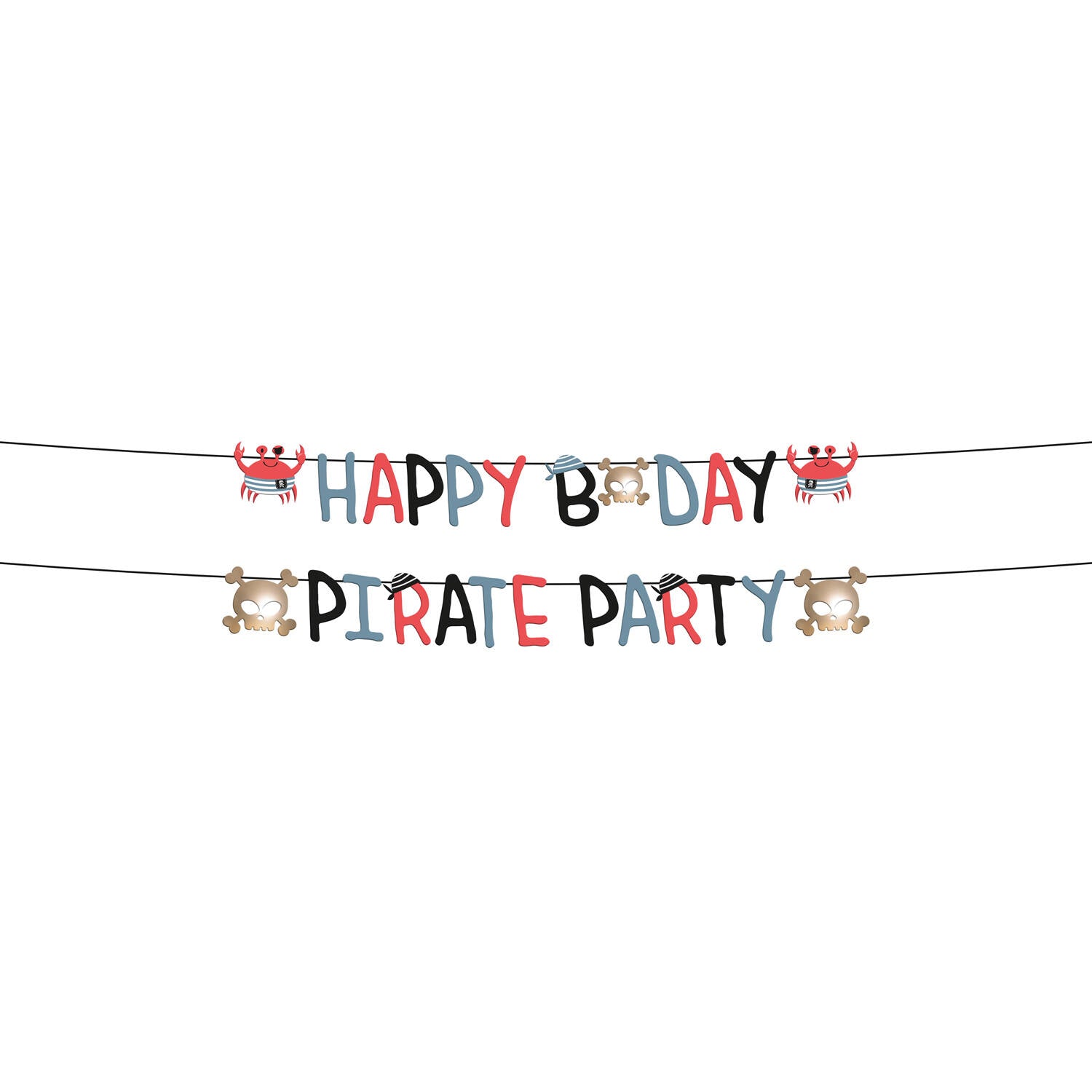 Zeigen Sie, wer die echten Piraten sind! Die Girlande besteht aus zwei Teilen: einer Girlande mit der Aufschrift „HAPPY BDAY“ (ca. 14 cm hoch) mit 2 Krabben und einem Totenkopf auf beiden Seiten und einer Girlande mit der Aufschrift „PIRATE PARTY“ (ca. 14 cm hoch) mit 2 Totenköpfen auf beiden Seiten. Beide Girlanden sind 1 Meter lang. Die Krebse, Totenköpfe und Buchstaben können auf dem schwarzen Band hin und her geschoben werden. Dieses Buchstabengirlanden-Set gehört zu der Kollektion Pirate Party von Folat. Dieser Artikel besteht aus Papier .